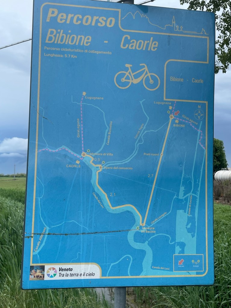 Da ist er schon, der ausgeschilderte Radweg Bibione-Caorle und da es nur noch regnet auf geht’s!