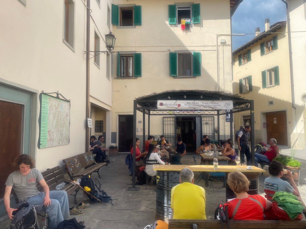 Aber ich finde das gebuchte Quartier nicht. Warum auch hier die Zimmer knapp sind Weiß ich jetzt. Um umkreis von 25-30 km gibt es nur Berge und Wald und sehr viele Wanderer und Biker. Das B&B Villa Bianca kann ich nicht finden. Ich habe nur eine Strasse keine Hausnummer, die Strasse is aber 10 km lang mit mindestens 5 Abzweigen. Rings um den Ort geht es steil hoch. GPS Koordinaten sind für das Anwesen nicht Verfügbar. Komoot , Google Maps, und Booking versagen bei der Zielführung. Ich rufe dort an es geht niemand dran. Ich halte einen Autofahrer an. Na klar spricht nur Italienisch. Mache ihm trotzdem mein Problem klar. Er kennt die Pension nicht, sucht selbst im Handy ohne Erfolg. Er hält ein weiteres Auto an die kennen es auch nicht. Es kommt ein drittes Auto, die kennen es auch nicht . Zwei weitere Leute suchen im Handy ! Ich lerne was neues dazu du musst nach dem Foto der Pension such. Das Haus haben sie schon mal gesehen. Der Freundliche Italiener macht das Führungsfahrzeug und ich folge mit dem Radl. Da es ständig bergauf und bergab geht muss er oft warten . Wir kommen an einem Haus an. Das ist es nicht 🙈. Wir rufen nochmal an . Es geht jemand hin. Er lässt sich geschlagene 5:30 min den Weg erklären. Er wohnt dort und das ist nicht grösser als Geisenbrunn. Er bringt mich hin. Ich will ihn ein Trinkgeld für ein Wein geben, er umarmt mich sagt so was wie gerne für meinen deutschen Freund. Er nimmt es nicht und wünscht mir eine schöne Tour.