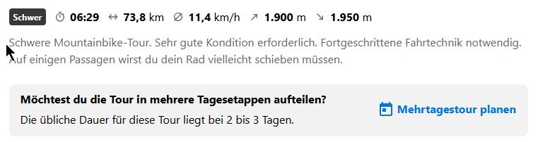 9. Wenn Komoot dir dies sagt: (siehe Bild) nach Planung deiner Etappe. Dann wirklich nochmal genau hinschauen und ggf die Etappe umbauen und entschärfen.